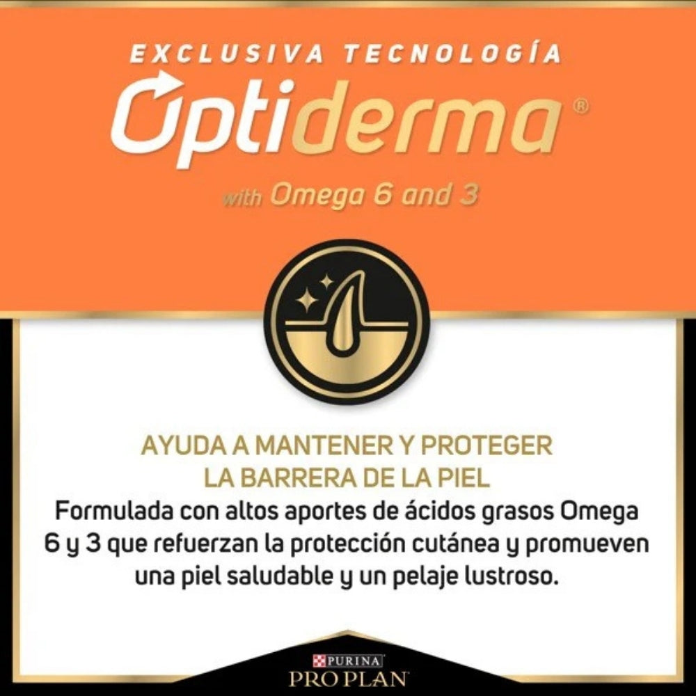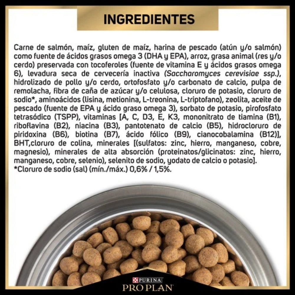 Pro Plan Sensitive Skin Adultos Razas Pequeñas de Salmón en presentación de 7.5 kg está formulado para perros adultos de razas pequeñas que presentan sensibilidad cutánea o digestiva. Contiene salmón como primer ingrediente, una fuente de proteína de alta calidad que ayuda a reducir las reacciones adversas a ingredientes comunes. Su fórmula rica en ácidos grasos omega 3 y 6, vitamina A y zinc fortalece la barrera cutánea, promoviendo una piel sana y un pelaje brillante. También incluye prebióticos que favorecen una buena digestión y el equilibrio de la flora intestinal. Las croquetas pequeñas están diseñadas para adaptarse a las mandíbulas de perros pequeños, facilitando la masticación y mejorando la aceptación.