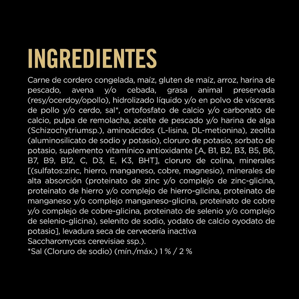 Cordero, arroz, avena, grasa animal estabilizada, pulpa de remolacha, aceite de pescado (fuente de omega 3), minerales quelados, prebióticos (FOS), vitaminas (A, C, D, E, complejo B), zinc, antioxidantes naturales.