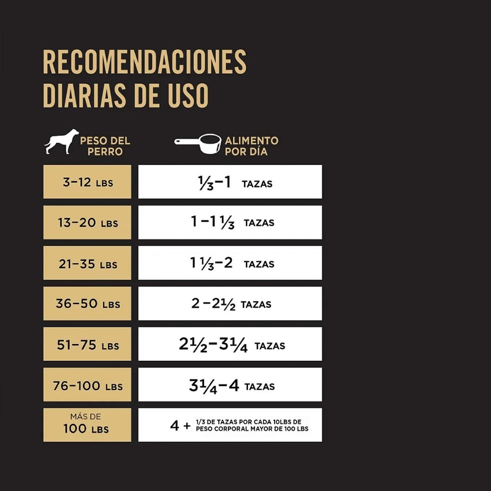 Servir seco como alimento exclusivo. Ajustar la cantidad diaria de acuerdo con el peso, edad y nivel de actividad del perro. Dividir en 2 tomas al día.