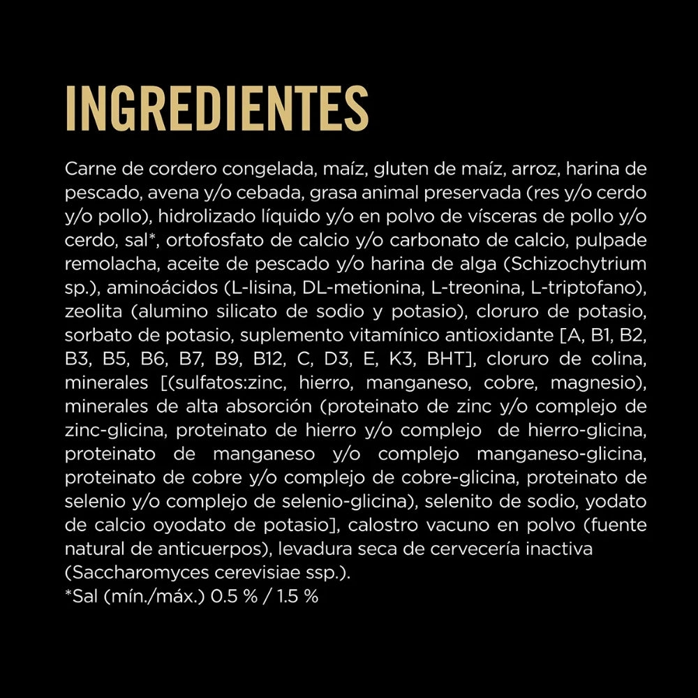 Cordero, arroz, avena, grasa animal estabilizada, pulpa de remolacha, aceite de pescado (fuente de DHA y omega 3), minerales quelados, prebióticos (FOS), vitaminas (A, C, D, E, complejo B), zinc, antioxidantes naturales.