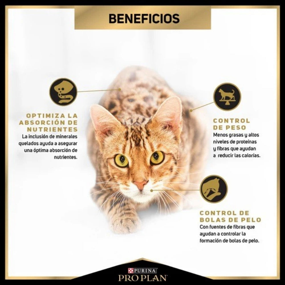 Pro Plan Sterilized Gatos Castrados de Salmón está diseñado específicamente para gatos adultos esterilizados, que suelen tener mayor riesgo de aumento de peso y problemas urinarios. Contiene salmón como fuente principal de proteína, de alta calidad y fácil digestión, que ayuda a conservar la masa muscular. Su fórmula baja en grasas y con un nivel controlado de calorías favorece el mantenimiento del peso ideal. Además, incorpora una mezcla de fibras naturales que promueven la saciedad y prebióticos que contribuyen al equilibrio de la flora intestinal. Los minerales esenciales ayudan a mantener un pH urinario adecuado y a prevenir la formación de cálculos.