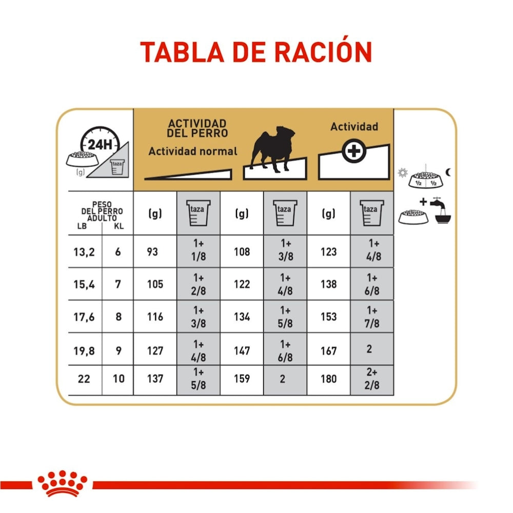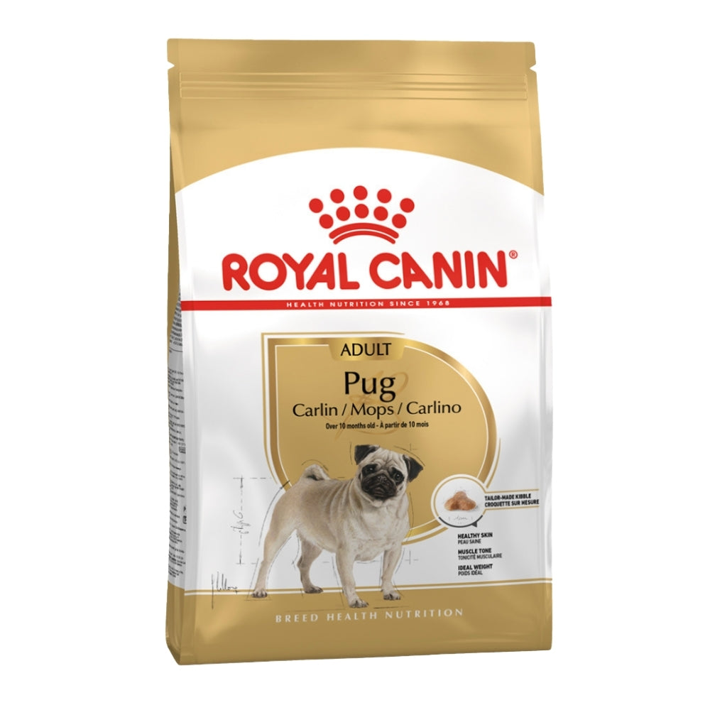 Royal Canin Adult Pug está formulado específicamente para satisfacer las necesidades nutricionales del Carlino (Pug) adulto a partir de los 10 meses. Esta raza presenta una piel sensible, una estructura compacta y una mandíbula braquicefálica, por lo que su alimentación debe ser precisa. Su fórmula incluye un complejo exclusivo que refuerza la barrera cutánea y ayuda a mantener la salud de la piel, así como nutrientes que contribuyen al mantenimiento del tono muscular y la salud articular. La croqueta tiene una forma especialmente adaptada para facilitar la prensión y estimular la masticación, reduciendo también la velocidad de ingesta.
