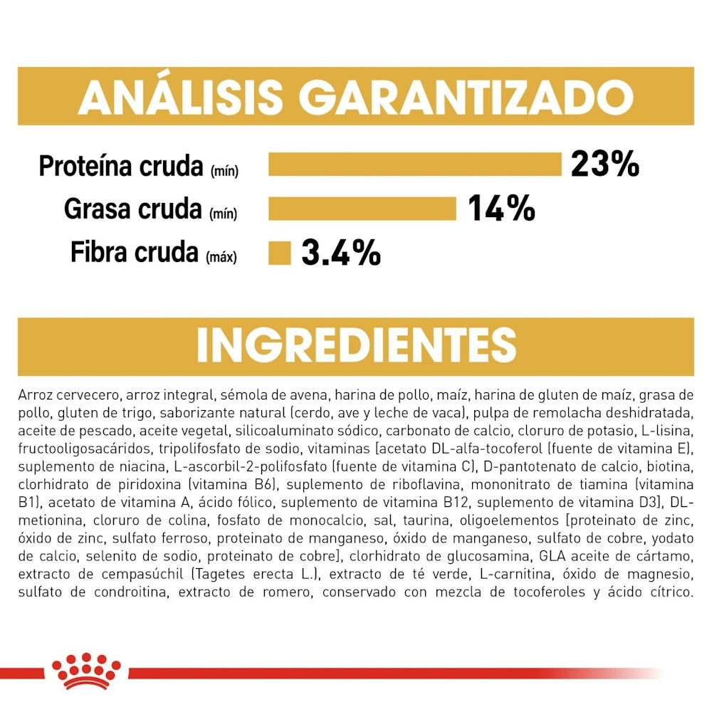 Arroz, proteínas de ave deshidratadas, grasas animales, fibras vegetales, pulpa de remolacha, aceite de pescado, aceite vegetal, hidrolizado de proteínas animales, minerales, prebióticos (FOS), extracto de rosa de la India (fuente de luteína), vitaminas y antioxidantes.