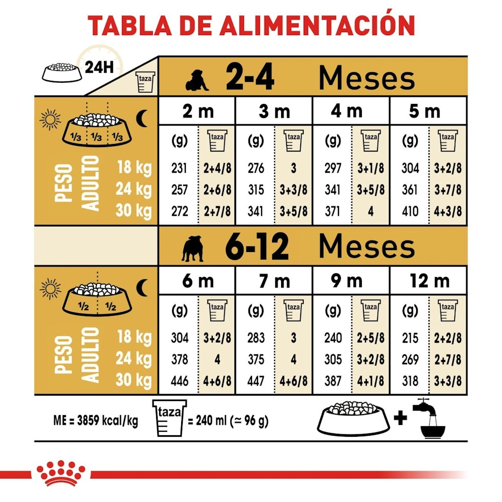 Royal Canin Puppy Bulldog Inglés está formulado específicamente para satisfacer las necesidades nutricionales de los cachorros de esta raza entre los 2 y 12 meses de edad. Su fórmula contribuye al equilibrio de la flora intestinal y favorece una digestión saludable, ayudando a reducir los olores y volumen de las heces. Contiene un complejo de antioxidantes con vitamina E que apoya el desarrollo de las defensas naturales. Además, su contenido adaptado de calcio y fósforo favorece el desarrollo óptimo de huesos y articulaciones, fundamentales en una raza propensa a problemas articulares. La croqueta está diseñada para adaptarse a la mandíbula braquicéfala del Bulldog, facilitando la prensión y estimulando la masticación.