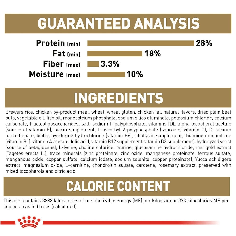 Arroz, proteínas de ave deshidratadas, grasas animales, aislado de proteínas vegetales, pulpa de remolacha, aceite de pescado, fibras vegetales, prebióticos (FOS y MOS), levaduras, minerales, extracto de rosa de la India (fuente de luteína), vitaminas y antioxidantes.