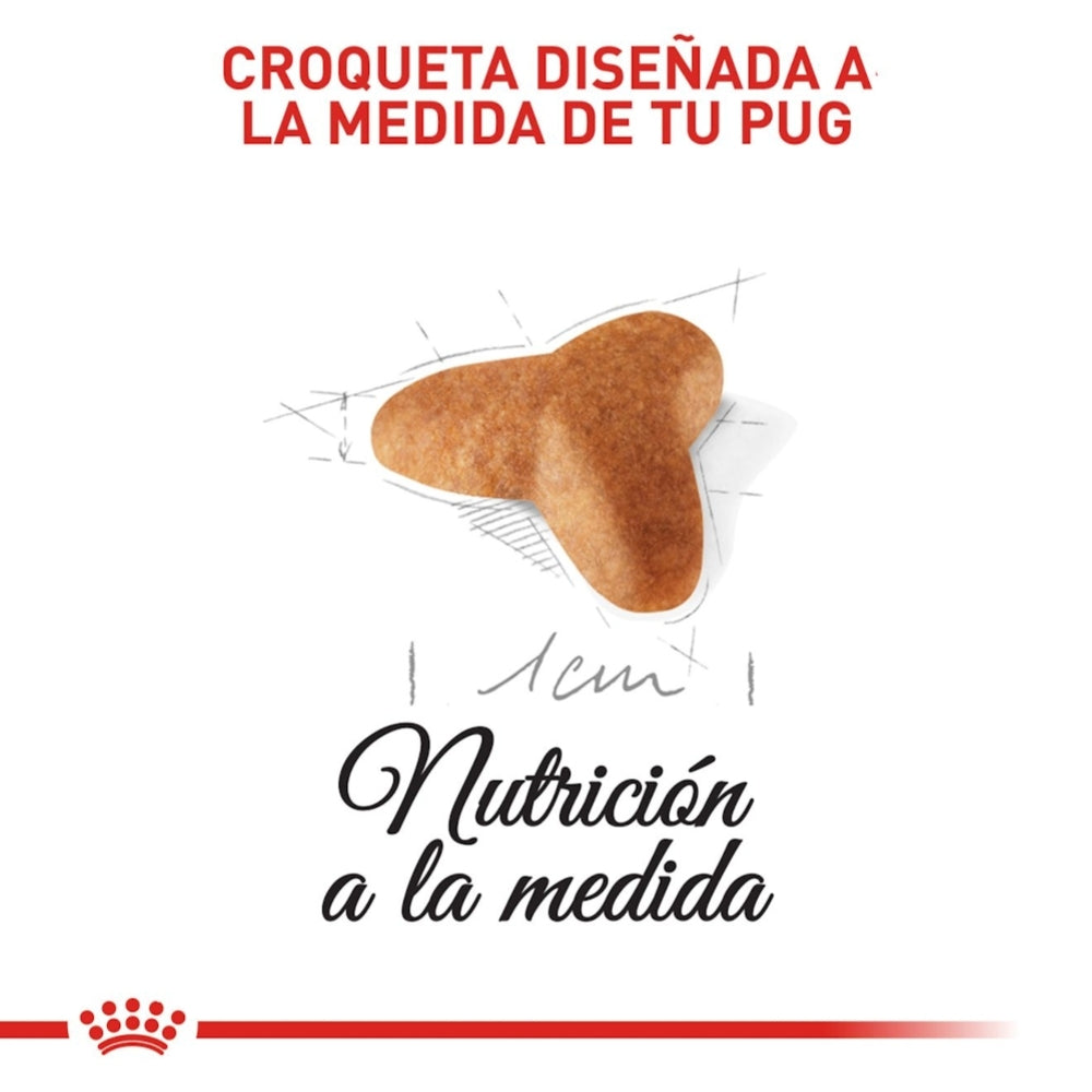 Royal Canin Puppy Pug está formulado especialmente para satisfacer las necesidades nutricionales del cachorro de raza Pug durante su etapa de crecimiento, desde los 2 hasta los 10 meses. Su fórmula exclusiva ayuda a reforzar el sistema inmune con un complejo de antioxidantes, incluyendo vitamina E. Contiene proteínas de alta digestibilidad y prebióticos para promover una digestión sana y un equilibrio en la flora intestinal. Además, gracias a los ácidos grasos omega 3 (EPA y DHA), protege la barrera cutánea y ayuda a mantener la piel saludable y el pelaje brillante. Su croqueta está diseñada para adaptarse a la forma de la mandíbula del Pug, facilitando la prensión y estimulando la masticación.