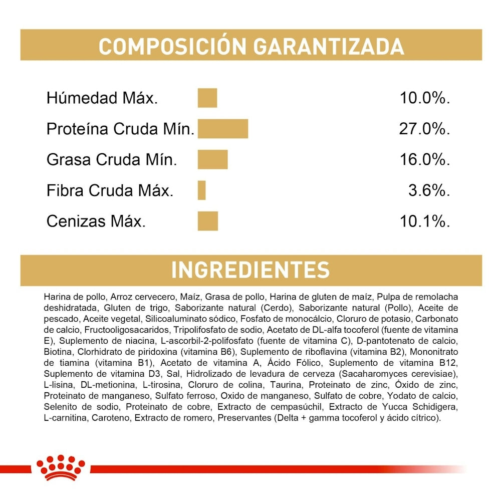 Arroz, proteínas de ave deshidratadas, grasas animales, harina de maíz, pulpa de remolacha, aceite de pescado, fibras vegetales, levaduras, minerales, prebióticos (FOS y MOS), extracto de rosa de la India (fuente de luteína), vitaminas y antioxidantes.