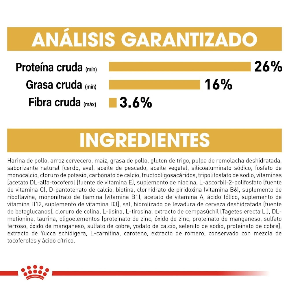 Arroz, proteínas de ave deshidratadas, grasas animales, harina de maíz, pulpa de remolacha, aceite de pescado, aceite de soja, aceite de borraja, fibras vegetales, levaduras, minerales, prebióticos (FOS y MOS), extracto de rosa de la India (fuente de luteína), vitaminas y antioxidantes.