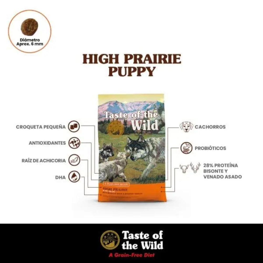 Taste Of The Wild High Prairie Puppy con Bisonte y Venado es un alimento completo y balanceado formulado especialmente para cachorros de todas las razas. Utiliza proteínas de alta calidad provenientes de bisonte y venado deshidratados, que aportan aminoácidos esenciales para el desarrollo muscular y el fortalecimiento del sistema inmunológico. Su fórmula sin cereales incluye carbohidratos saludables como batata y guisantes, además de antioxidantes naturales de frutas y vegetales para proteger las células del estrés oxidativo. Enriquecido con ácidos grasos omega-3 y omega-6, promueve una piel saludable y un pelaje brillante durante las etapas iniciales de la vida. También contiene prebióticos que favorecen la salud digestiva y un tracto intestinal equilibrado.